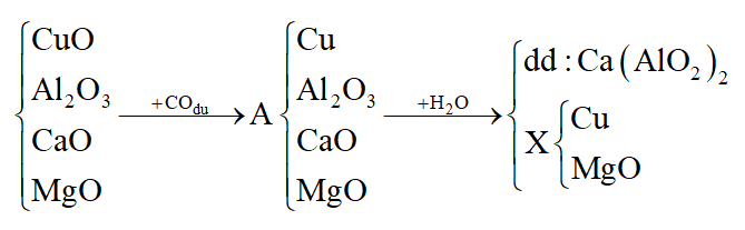 Dẫn luồng khí CO dư qua hỗn hợp CuO, Al2O3, CaO, MgO có số mol bằng nhau (nung nóng ở nhiệt độ cao) thu được chất rắn A. Hòa tan A vào nước dư còn lại chất rắn X. X gồm: