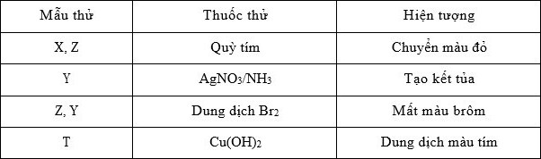 Tiến hành thí nghiệm với các chất X, Y, Z, T. Kết quả được ghi ở bảng sau: