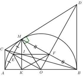 Cho điểm M thuộc nửa đường tròn \(\left( {O;R} \right)\), đường kính AB (M khác A và B). Gọi E và F lần lượt là trung điểm của MA và MB.