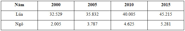 Cho bảng số liệu sau: Sản lượng lúa và ngô của nước ta giai đoạn 2000-2015 (Đơn vị: nghìn