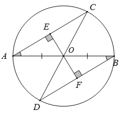 Cho đường tròn tâm O, đường kính AB. Hai dây AC và BD song song với nhau. E và F lần lượt là hình chiếu của O trên AC, BD. Chọn câu đúng nhất