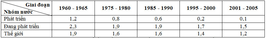 Cho bảng số liệu: Tỉ suất gia tăng dân số tự nhiên trung bình của thế giới và các nhóm