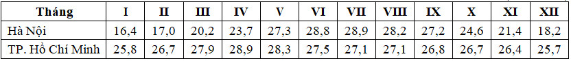 Cho bảng số liệu: Nhiệt độ trung bình của Hà Nội và Thành phố Hồ Chí Minh (Đơn vị:0