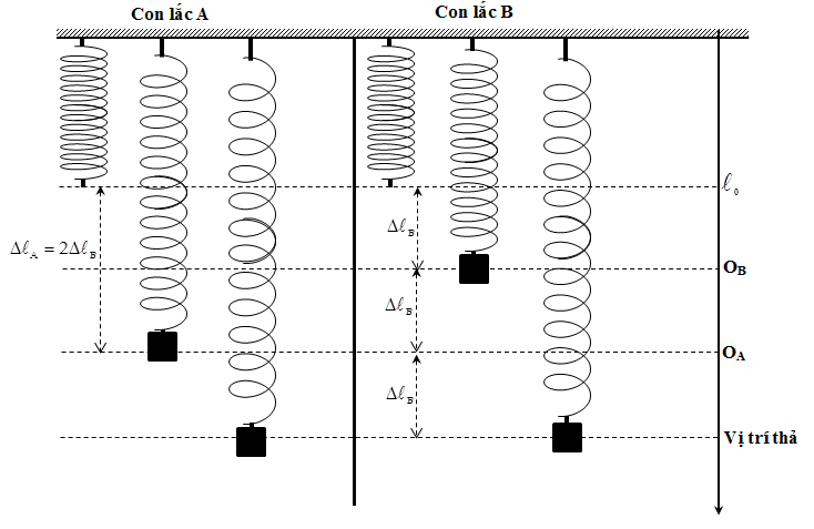 Tiến hành thí nghiệm với hai con lắc lò xo A và B có quả nặng và chiều dài tự nhiên giống