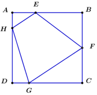 Cho một mảnh giấy hình vuông \(ABCD\) cạnh \(6cm.\) Gọi \(E,\;F\) lần lượ là hai điểm nằm trên cạnh \(AB\) và \(BC\) sao cho \(AE = 2cm,\;BF = 3cm.\) Bạn Nam muốn cắt một hình thang \(EFGH\) (như hình vẽ) sao cho hình thang đó có diện tích nhỏ nhất. Xác định vị trí của \(H\) trên cạnh \(AD,\) để bạn Nam có thể thực hiện mong muốn của mình?
