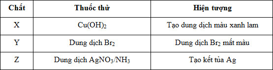 Kết quả thí nghiệm của các chất X, Y, Z với các thuốc thử được ghi ở bảng sau: Các chất