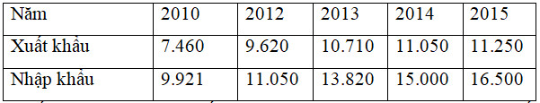 Từ bảng số liệu trên, hãy cho biết nhận xét nào sau đây đúng vê giá trị xuất nhập khẩu của nước ta giai đoạn 2010 – 2015?