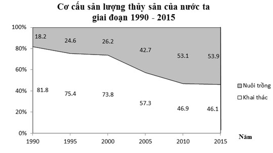 Căn cứ vào biểu đồ trên, cho biết nhận xét nào sau đây không đúng về sự thay đổi tỉ trọng trong cơ cấu ngành thủy sản nước ta giai đoạn 1990 – 2015?