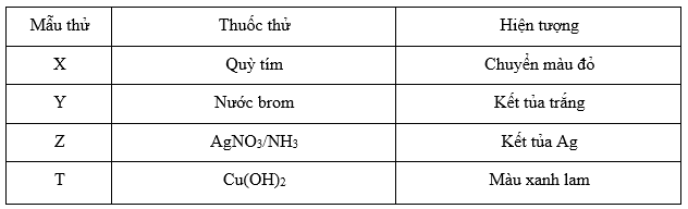 Kết quả thí nghiệm của các dung dịch X, Y, Z, T với thuốc thử được ghi ở bảng sau: Các dung