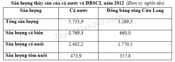 Cho bảng số liệu: Sản lượng thủy sản của cả nước và ĐBSCL năm 2012 (Đơn vị: nghìn