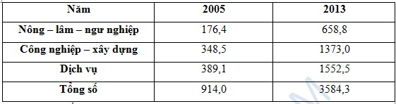 Cho bảng số liệu sau: GDP phân theo ngành nước ta năm 2005, 2013 (Đơn vị: nghìn tỷ đồng) Từ