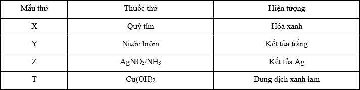 Kết quả thí nghiệm của các dung dịch X, Y, Z, T với thuốc thử được mô tả ở bảng sau:
