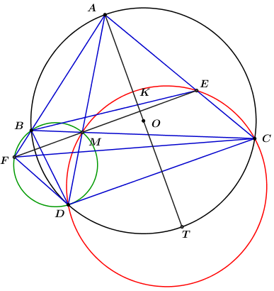 1) Cho tam giác ABC nhọn nội tiếp (O) có AB < AC. Gọi M thuộc cạnh BC khác B và C, AM cắt (O) tại D khác A. Đường tròn ngoại tiếp tam giác MCD cắt AC tại E, đường tròn ngoại tiếp tam giác MBD cắt AB tại F khác B.