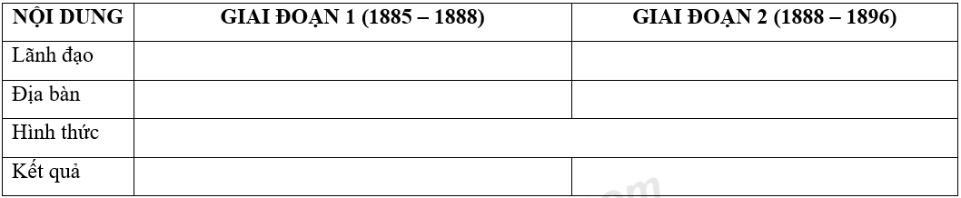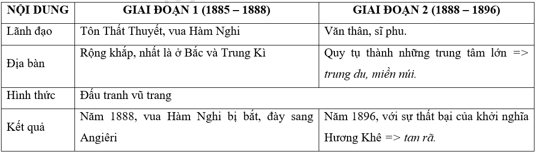 Phong trào Cần Vương chia thành mấy giai đoạn? Hãy trình bày nội dung chính của từng giai đoạn đó bằng cách hoàn thiện bảng sau: