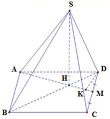 Cho hình chóp \(S.ABCD\) có đáy \(ABCD\) là hình bình hành có diện tích bằng \(2{a^2}\) ,\(AB = a\sqrt 2 ;BC = 2a\). Gọi \(M\) là trung điểm của \(DC\) . Hai mặt phẳng \(\left( {SBD} \right)\) và \(\left( {SAM} \right)\) cùng vuông góc với đáy. Khoảng cách từ điểm \(B\) đến mặt phẳng \(\left( {SAM} \right)\) bằng
