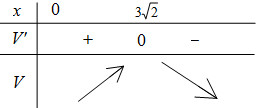 \(V' = 0 \Leftrightarrow 36 - {x^2} - {x^2} = 0 \Leftrightarrow \left[ \begin{array}{l}x = 3\sqrt 2 \,\,\,\,\,\,\,\left( {tm} \right)\\x = - 3\sqrt 2 \,\,\,\left( {ktm} \right)\end{array} \right.\)