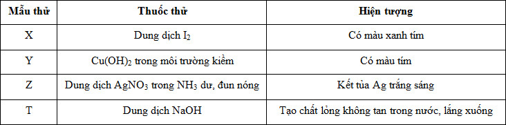 Kết quả thí nghiệm của các dung dịch X, Y, Z, T với thuốc thử được ghi ở bảng sau:
