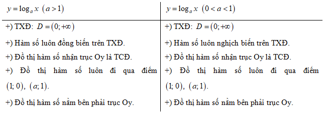 Xét hàm số \(y = {\log _a}x\;\;\left( {0 < a \ne 1} \right)\) ta có: