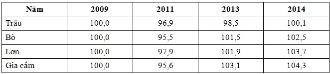 Cho bảng số liệu sau : CHỈ SỐ PHÁT TRIỂN ĐÀN GIA SÚC VÀ GIA CẦM Ở NƯỚC TA GIAI ĐOẠN 2009