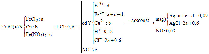 nAg+ = nAgCl + nAg ⟹ a + c - d - 0,09 + 2a + 0,6 = 0,87 (3)