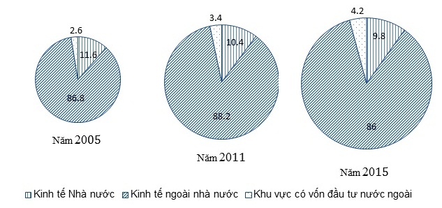 Nhận xét nào sau đây đúng với sự thay đổi cơ cấu lao động 15 tuổi trở lên đang làm việc phân theo thành phần kinh tế của nước ta từ năm 2005 và 2015?