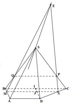 Cho hình chóp S.ABCD có đáy là hình thang ABCD với đáy lớn \(BC = 2a\) và \(AD = AB = a\). Mặt bên SAD là tam giác đều. Gọi M là điểm bất kì thuộc cạnh AB. Mặt phẳng \(\left( \alpha \right)\) đi qua M và song song với SA, BC, cắt CD, SC, SB lần lượt tại N, P, Q.