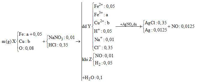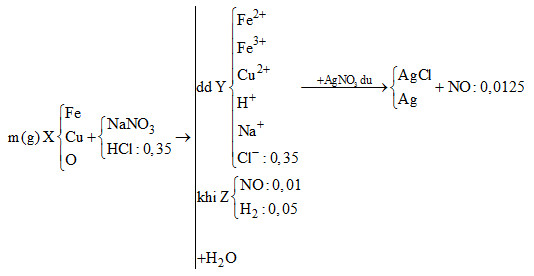 Hòa tan hoàn toàn m gam hỗn hợp X gồm Fe, Cu và oxit sắt bằng hỗn hợp dung dịch chứa NaNO3 và 0,35 mol HCl, thu được dung dịch Y và 1,344 lít hỗn hợp khí Z có tỉ khối so với hiđro là 20/6. Cho dung dịch AgNO3 dư vào dung dịch Y trên thì thu thêm được 0,28 lít NO ở đktc và 51,575 gam kết tủa. Nếu lấy 61 gam hỗn hợp X thì có thể điều chế tối đa 53 gam kim loại. Phát biểu nào sau đây đúng? (Biết NO là sản phẩm khử duy nhất của N+5 trong toàn bộ bài toán).