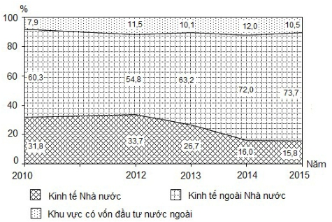 Theo biểu đồ, nhận xét nào sau đây đúng về sự thay đổi tỉ trọng trong cơ cấu doanh thu dịch vụ lữ hành phân theo thành phần kinh tế của nước ta, giai đoạn 2010 - 2015?