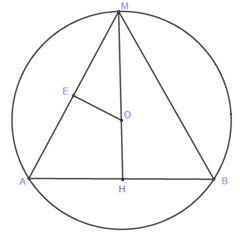 Cho tam giác \(AMB\) cân tại \(M\) nội tiếp đường tròn \(\left( {O;R} \right)\). Kẻ \(MH \bot AB\;\;(H
