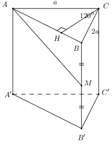 Cho lăng trụ đứng \(ABC.A'B'C'\) có \(AC = a;\,BC = 2a,\,\angle ACB = {120^0}.\) Gọi \(M\) là trung điểm