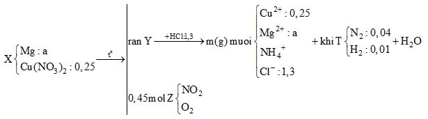 Nung hỗn hợp X gồm a (mol) Mg và 0,25 mol Cu(NO3)2, sau một thời gian thu được chất rắn Y và 0,45