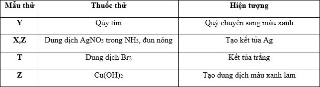 Tiến hành thí nghiệm với các dung dịch X, Y, Z và T. Kết quả được ghi ở bảng sau: X, Y, Z, T
