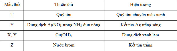 Kết quả thí nghiệm của các dung dịch X, Y, Z, T với thuốc thử được ghi ở bảng sau: