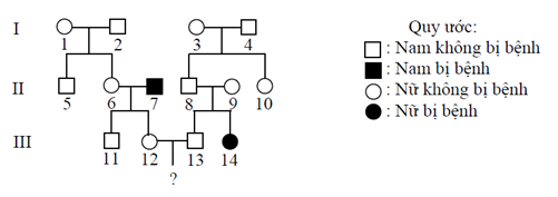 Sơ đồ phả hệ sau đây mô tả một bệnh di truyền ở người do một trong hai alen của một gen qui định. Biết rằng không có đột biến mới phát sinh ở tất cả các cá thể trong phả hệ.