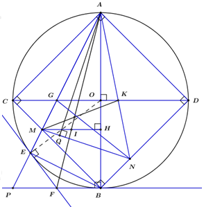 Cho đường tròn (O, R) có 2 đường kính AB và CD vuông góc với nhau. Trên dây BC lấy M (M khác B và C). Trên dây BD lấy N sao cho \(\angle MAN = \frac{1}{2}\angle CAD\), AN cắt CD tại K. Từ M kẻ MH vuông AB (H thuộc AB).