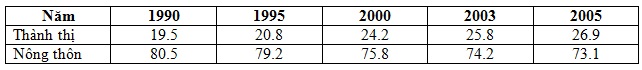 Cơ cấu dân số phân theo thành thị và nông thôn (%) Nhân xét nào sau đây đúng về cơ cấu