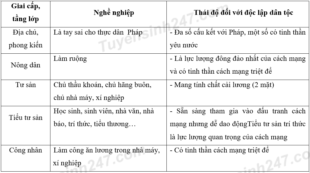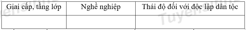 Dựa vào nội dung về các giai cấp, tầng lớp trong xã hội Việt Nam cuối thế kỉ XIX, đầu thế kỉ XX (SGK Lịch sử 8, trang 140 - 142) để lập bảng.