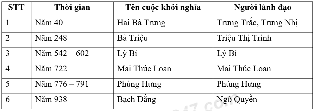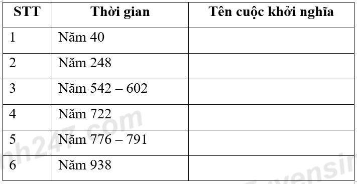 Hoàn thành bảng thống kê các sự kiện lịch sử tiêu biểu của nhân dân ta trong thời kì Bắc thuộc theo mẫu sau: