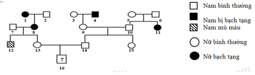 Người, bệnh bạch tạng do gen lặn nằm trên NST thường quy định, alen trội tương ứng quy định da bình thường. bệnh mù màu đỏ - xanh lục do gen lặn nằm trên vùng không tương đồng của NST giới tính X quy định, alen trội tương ứng quy định mắt nhìn màu bình thường. Cho sơ đồ phả hệ sau: