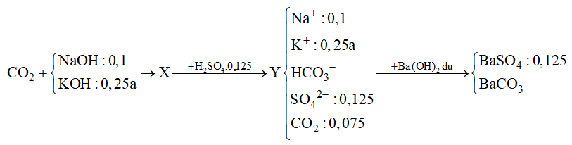 Hấp thụ hoàn toàn V lít khí CO2 (đktc) vào 250ml dung dịch hỗn hợp gồm NaOH 0,4M và KOH aM thu được dung dịch X. Cho từ từ 250 ml dung dịch H2SO4 0,5M vào X thu được dung dịch Y và 1,68 lít khí CO2 (đktc). Cho Y tác dụng với dung dịch Ba(OH)2 dư thấy xuất hiện 34,05 gam kết tủa trắng. Giá trị của a là