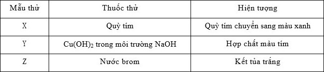 Kết quả thí nghiệm của các dung dịch X, Y, Z với thuốc thử được ghi ở bảng sau: X, Y, Z