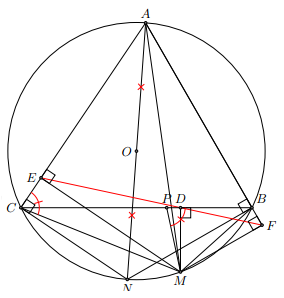Cho tam giác ABC có 3 góc nhọn nội tiếp đường tròn (O), kẻ đường kính AN. Lấy điểm M trên cung nhỏ BN (M khác B và N). Kẻ MD vuông góc với đường thẳng BC tại D, ME vuông góc với đường thẳng AC tại E, MF vuông góc với đường thẳng AB tại F.