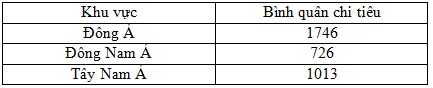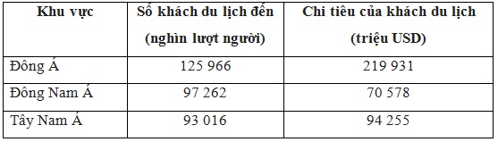 Nhận xét nào sau đây không đúng về số khách du lịch đến và mức chi tiêu của khách du lịch một số khu vực châu Á năm 2014?