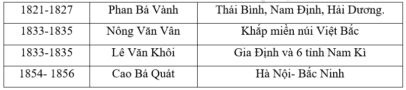 Lập bảng thống kê về phong trào khởi nghĩa của nông dân nửa đầu thế kỉ XIX và nêu nhận