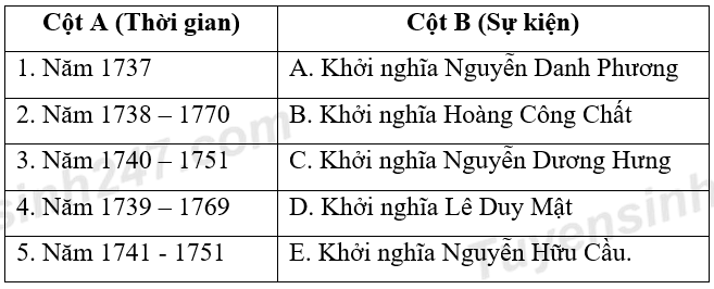 Nối thời gian ở cột A với sự kiện ở cột B sao cho thích