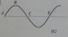 Một sóng cơ truyền trên mặt nước theo hướng từ A đến E có biên độ 2 cm, tốc độ truyền là 4 m/s. Tại một thời điểm nào đó các phần tử mặt nước có dạng như hình vẽ H2. Cho biết khoảng cách A đến C là 20 cm. Phần tử vật chất tại C đang
