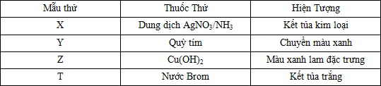 Kết quả thí nghiệm của các dung dịch X, Y, Z, T với các thuốc thử được cho trong bảng