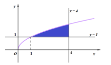 Cho hình phẳng (H) giới hạn bởi đồ thị các hàm số sau \(y = \sqrt x ,y = 1\) và đường thẳng \(x = 4\) (tham khảo hình vẽ). Thể tích khối tròn xoay sinh bởi hình (H) khi quay quanh đường thẳng \(y = 1\) bằng