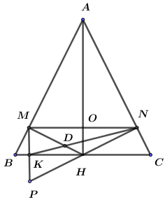 d) \(MP\) cắt \(BC\) tại điểm \(K.\) \({\rm N}K\) cắt \(MH\) tại điểm \(D.\) Chứng minh: ba đường thẳng \(AH,M{\rm N},DP\) cùng đi qua một điểm.