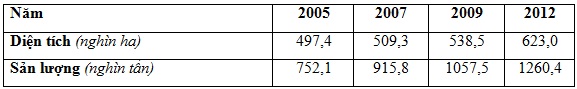 Cho bảng số liệu: DIỆN TÍCH VÀ SẢN LƯỢNG CÀ PHÊ CỦA NƯỚC TA GIAI ĐOẠN 2005 – 2012 (Nguồn: